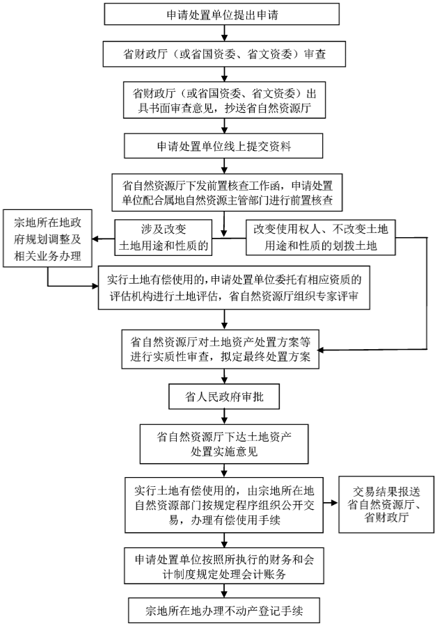 (一)处置事项线上办理。省直管土地资产处置事项申报、受理、核查、审批等程序通过省直管土地资产管理信息系统全流程线上办理。