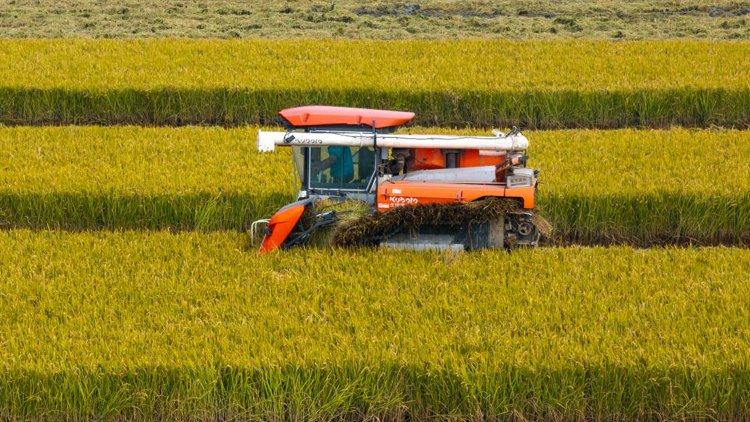 时下正值晚稻成熟期,各地农民抢抓农时收割水稻,田间一派繁忙景象。
