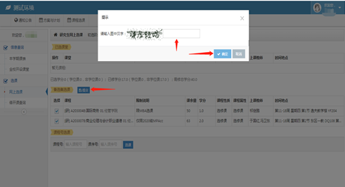 如果你完成了前文所述的准备工作,你要选修的课程就会出现在“备选集”中。(“备选集”中出现的是:已列入你的计划课程、本学期开课、未修过的课程。)选中备选集中出现的你要选修的课程,输入验证码并完成选课。