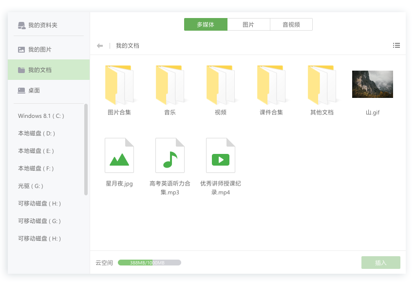 点击多媒体按钮后出现文件弹框如图所示。用户可切换多媒体、图片、音视频进行相应资源筛选,选中资源后,点击右下角的按钮可将所选资源导入课件。