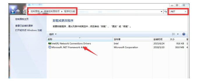 如图在电脑的控制面板的卸载程序中搜索Microsoft.NET Framework 进行卸载。