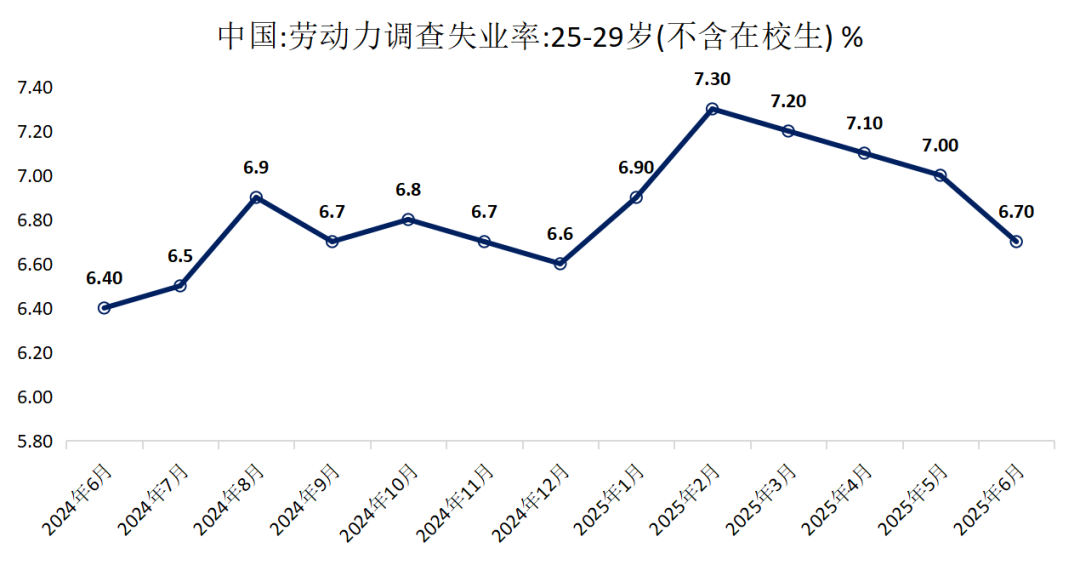 25-29岁(不含在校生)6月份调查失业率是6.7%,低于5月的7%,连续4个月下降。