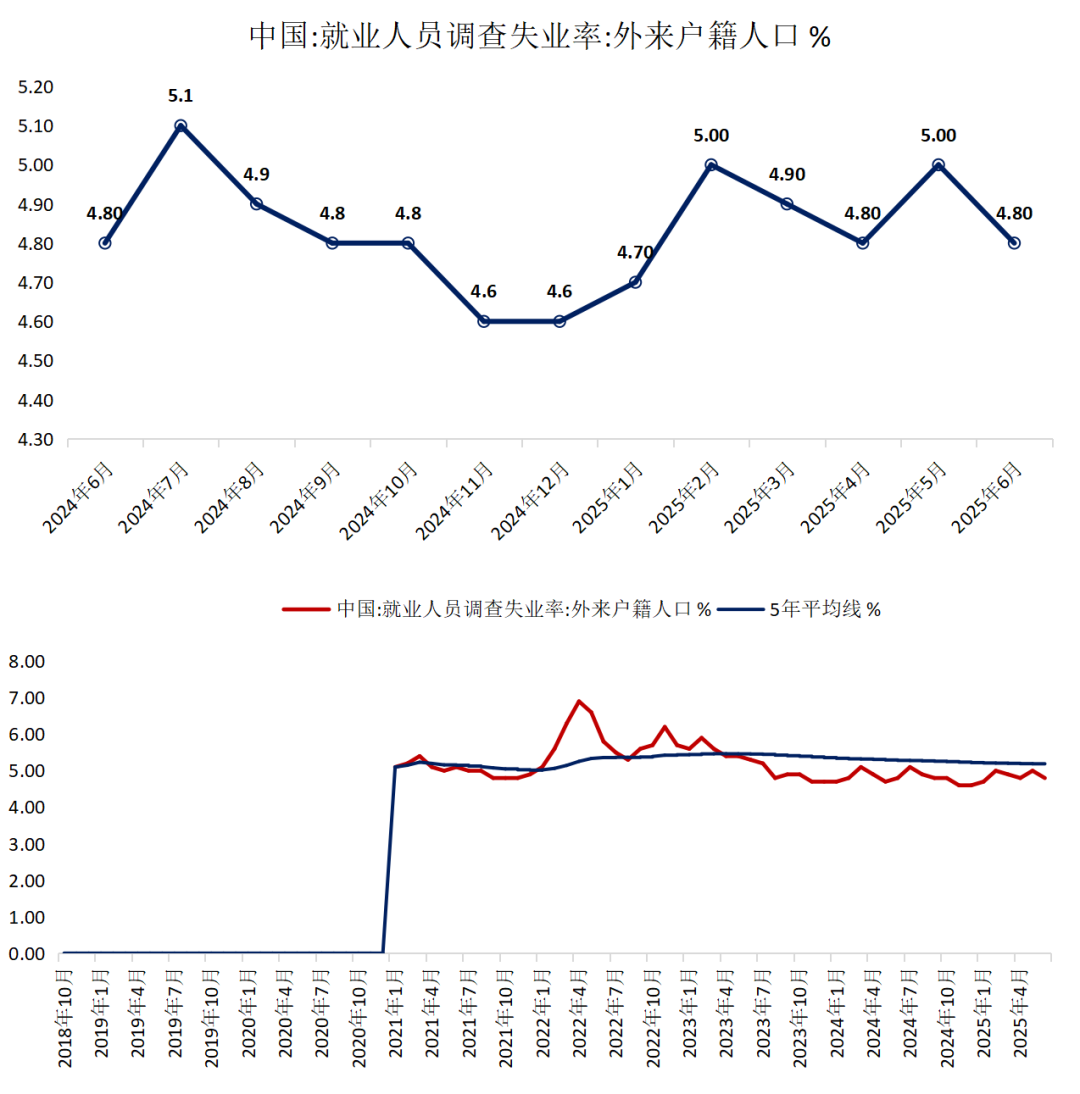 6月外来户籍人口失业率4.8%,低于5月的5%。