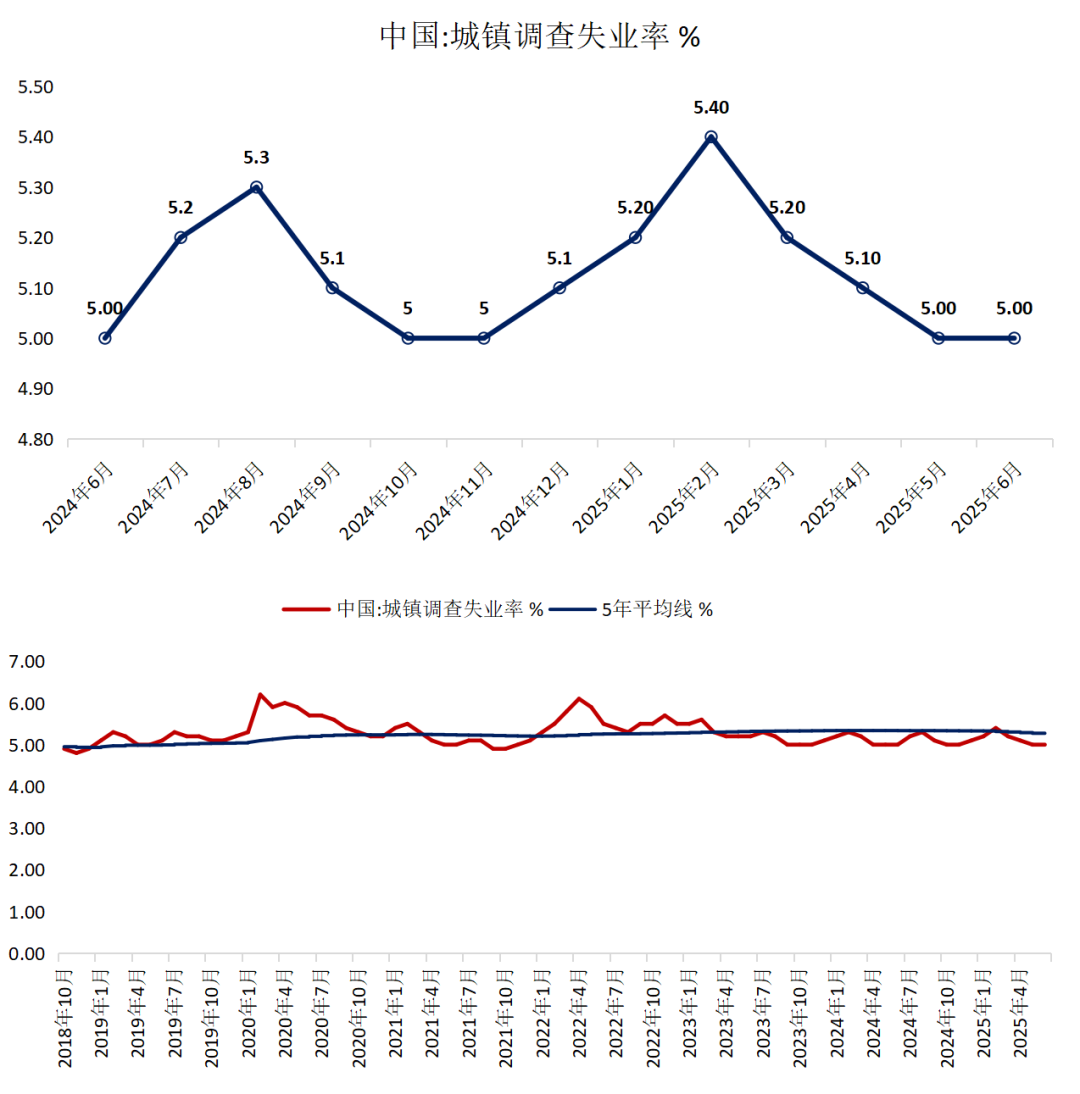 2025年6月份,中国城镇调查失业率5.0%,与5月一致。根据数据GO测算,最近5年(60个月)月度失业率均值是5.26%,目前5月数据低于60月均线之下。