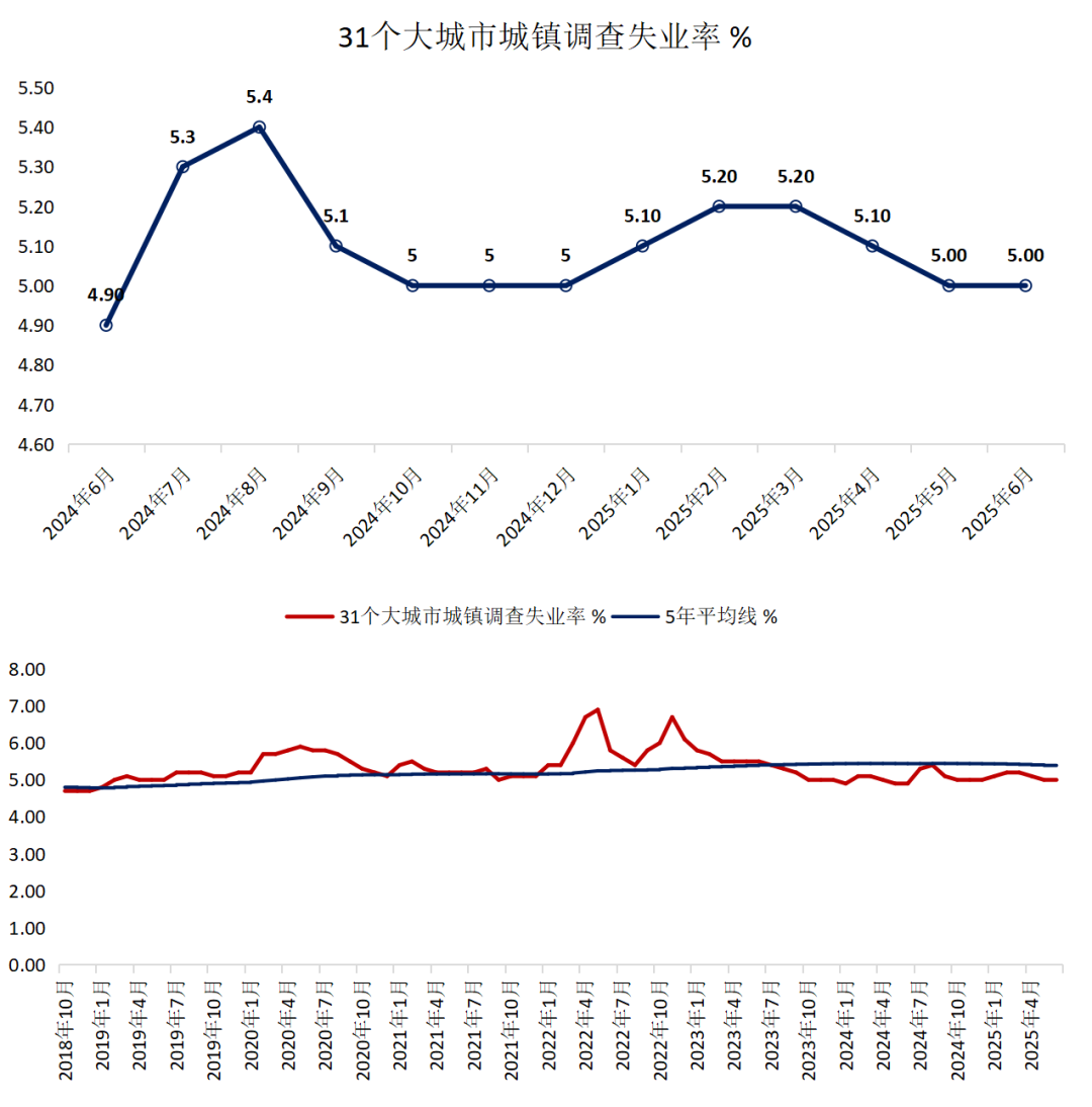 6月份,31个大城市城镇调查失业率是5.0%,持平于5月的5%。根据测算,最新5年历史均值失业率是5.38%,目前6月31个大城市城镇调查失业率连续24个月低于5年均值。