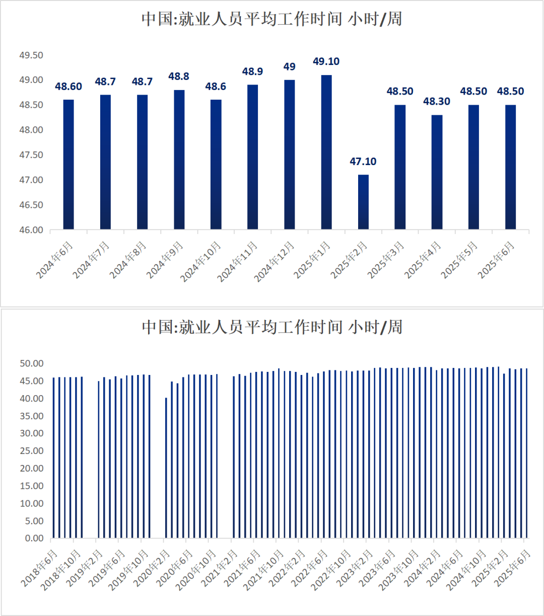 6月份,就业人员周均工作时间48.5小时,持平于5月份的48.5小时,低于2024年同期的48.6小时。