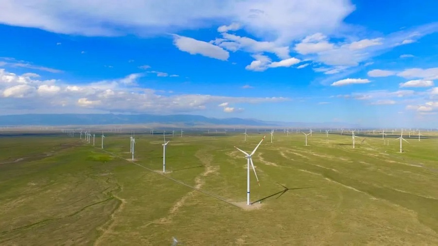 风车叶片在旷野中缓缓转动,将风能转化为源源不断的电力。