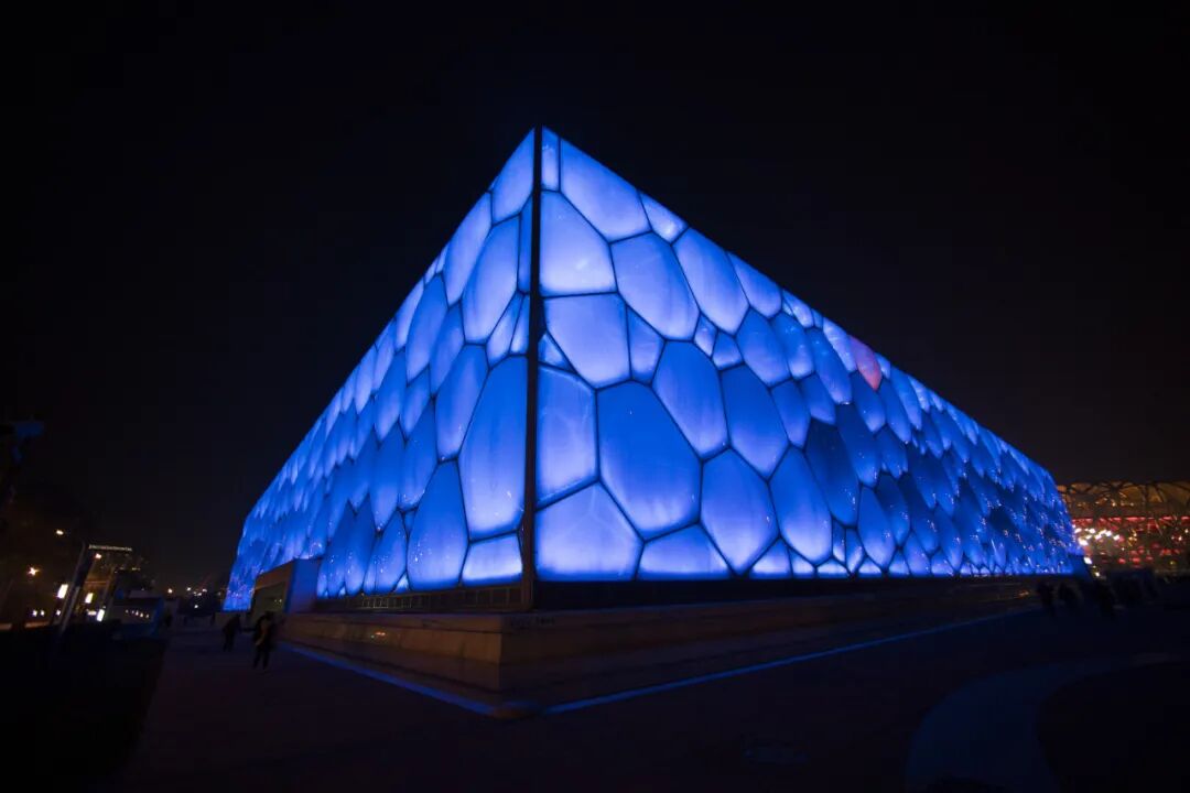 造型简洁现代的水立方,外观如同一个冰晶状的立方体,建筑风格独特,如今成为北京的标志性景点,亮灯后的水立方绚丽璀璨,晚上观赏效果最佳,超级出片!旁边就是鸟巢和奥林匹克塔,可以一起打卡。