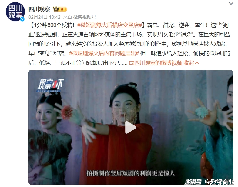 据“趣解商业”了解,2023年,抖音上每天主动搜索微短剧的用户数量增长2倍,播放量破亿的微短剧达500部,其中12部作品的播放量破10亿,微短剧日播放量增长了一倍。