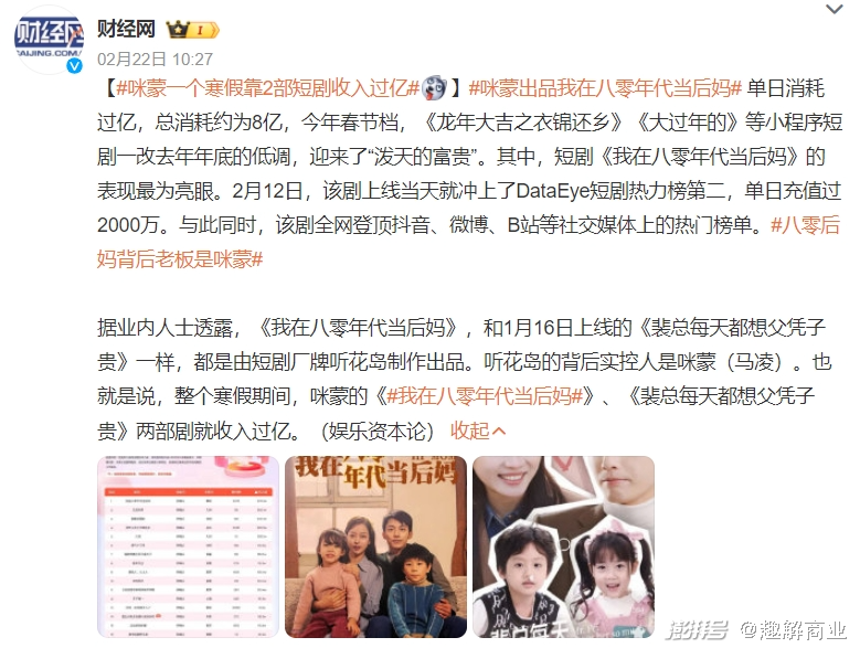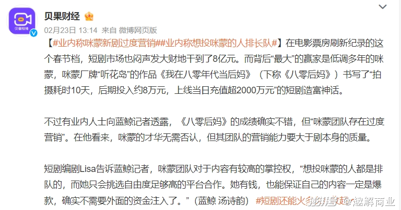 唯一的例外还是咪蒙旗下团队和其出品的《八零后妈》、《父凭子贵》,“短剧抢走8亿元春节档票房”就是以这两部短剧做营销由头迅速成了热点新闻。
