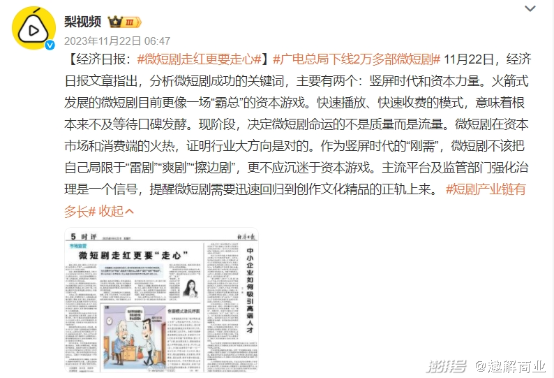 2023年11月,国家广电总局发出监管通知,加大网络微短剧管理力度、细化管理举措,其中包括制定创作生产与内容审核细则、推动网络为短剧APP和小程序进入日常机构管理范围、建立黑名单机制,加大对色情低俗、血腥暴力、格调低下、审美恶俗等内容的处理和曝光。