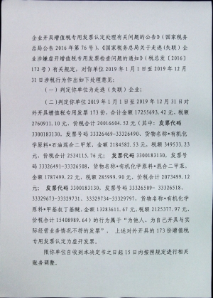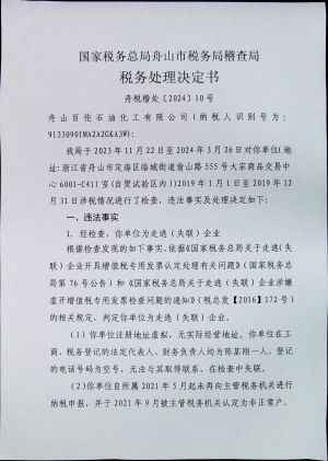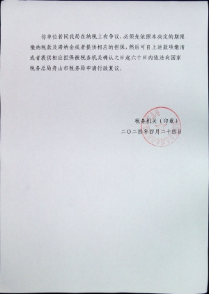 我局于2024年4月24日向你单位作出《税务处理决定书》(舟税稽处〔2024〕10号),由于你单位失联,注册地址是虚拟地址,文书通过直接送达、委托送达、留置送达、邮寄送达等其他送达方式无法送达,根据《中华人民共和国税收征收管理法实施细则》第一百零六条第二款之规定,现将该文书予以公告送达。自公告之日起满30日,即视为送达。