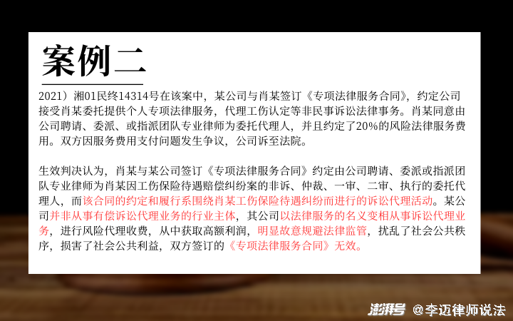 类似地,(2021)湘01民终14314号和(2021)辽01民终9567号判例也均认定法律公司与当事人签订的合同无效,因为法律公司并非从事有偿诉讼代理业务的合法主体,其通过法律服务名义变相从事诉讼代理业务,进行风险代理收费,明显规避了法律监管,扰乱了社会秩序,损害了公共利益。