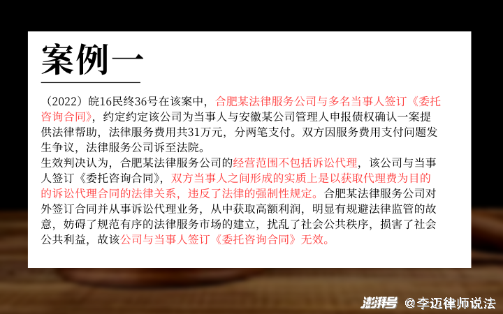以(2022)皖16民终36号判例为例,合肥某法律服务公司与多名当事人签订《委托咨询合同》,约定为当事人提供法律帮助,但因服务费用支付问题发生争议。法院最终认定,该法律服务公司的经营范围并不包括诉讼代理,其签订的合同实质上是诉讼代理合同,违反了法律的强制性规定,因此该合同无效。
