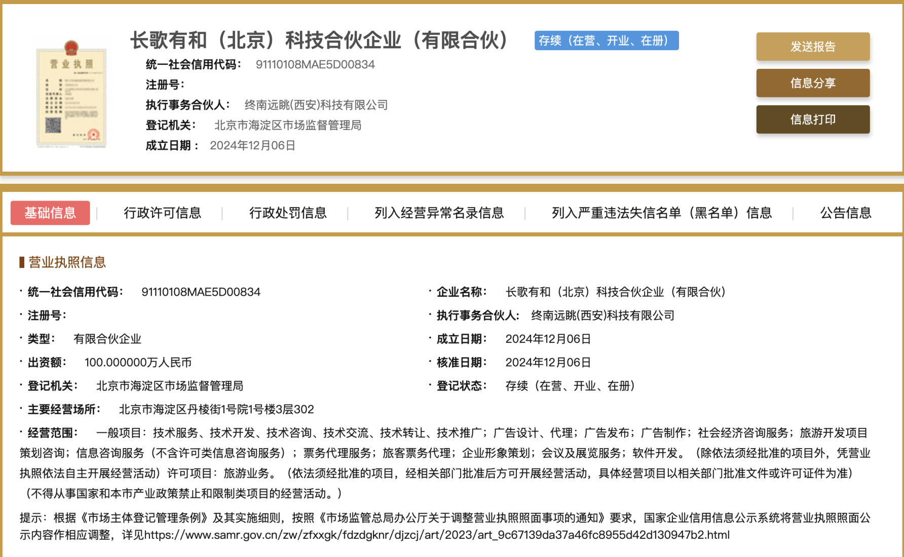 官网显示,长歌有和公司经营范围包含社会经济咨询服务、旅游开发项目策划咨询、票务代理服务、旅客票务代理、软件开发、旅游业务等。公司注册资金100万人民币,董宇辉持股99.9%,终南远眺持股0.1%。