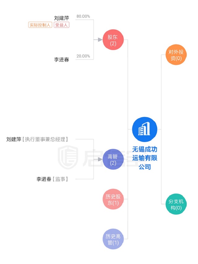 第一财经记者查询启信宝显示,无锡成功运输有限公司成立于2014年9月24日,注册地址是无锡市惠山区钱桥晓丰村久安停车场,注册资金500万元人民币,法人刘建萍,占公司股份为80%,另一名股东是李进春,占公司股份20%。