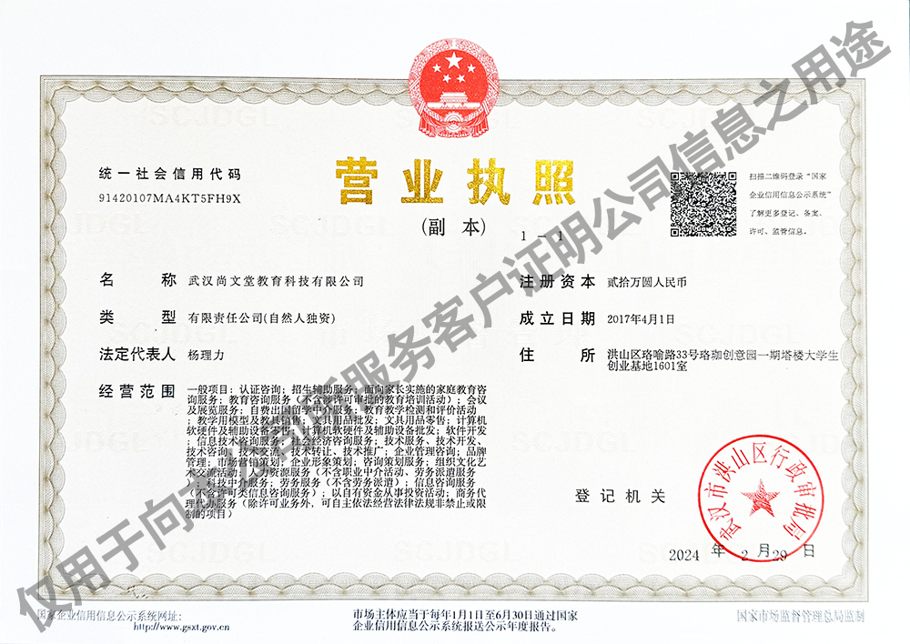 公司名称:武汉尚文堂教育科技有限公司;统一社会信用代码:91420107MA4KT5FH9X