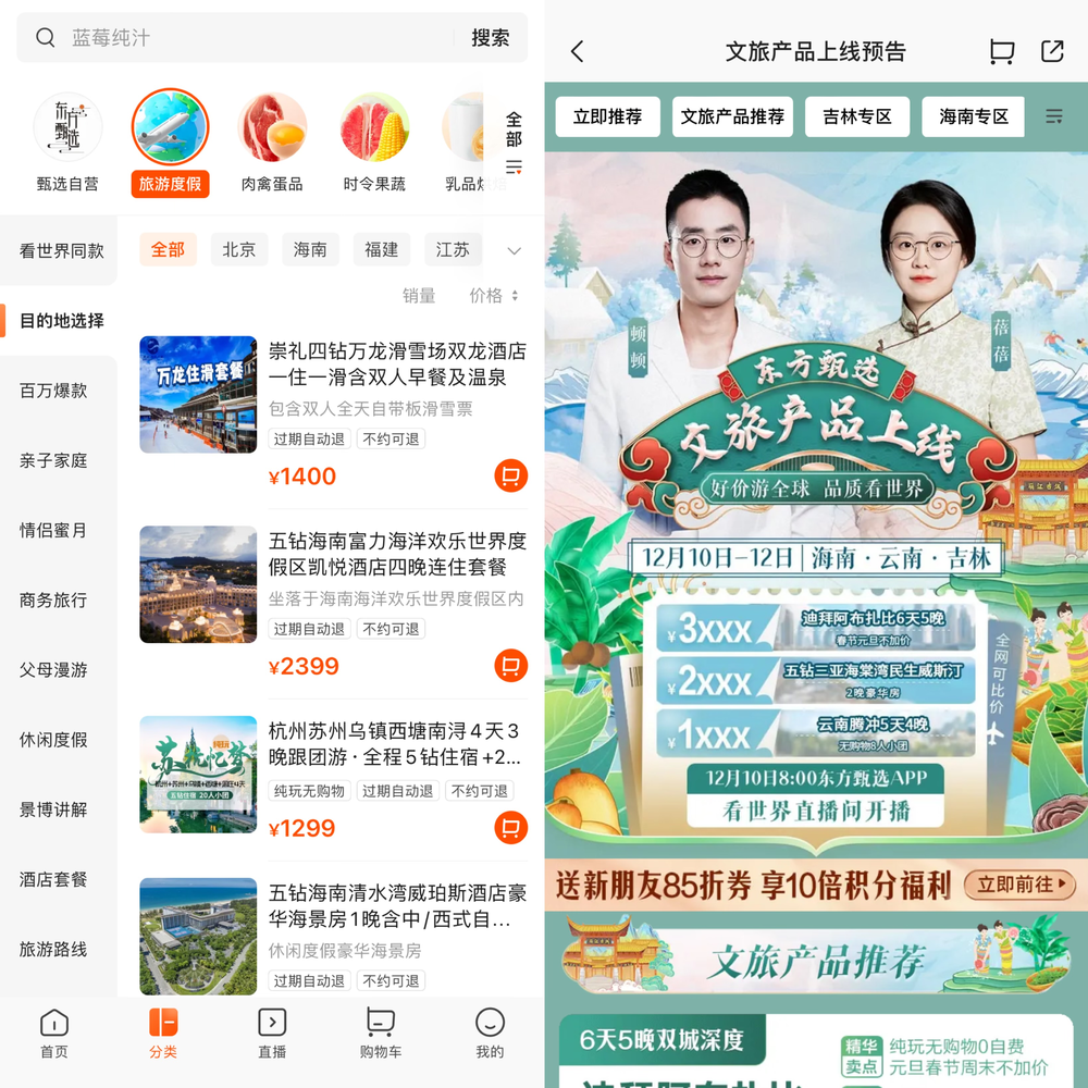 据悉,12月10日这次特殊的直播,是东方甄选在App首次上架文旅类产品。目前,超过100家企业已敲定合作意向,即将入驻,在东方甄选App上架旅游套餐、景点门票、酒店套餐等文旅产品。