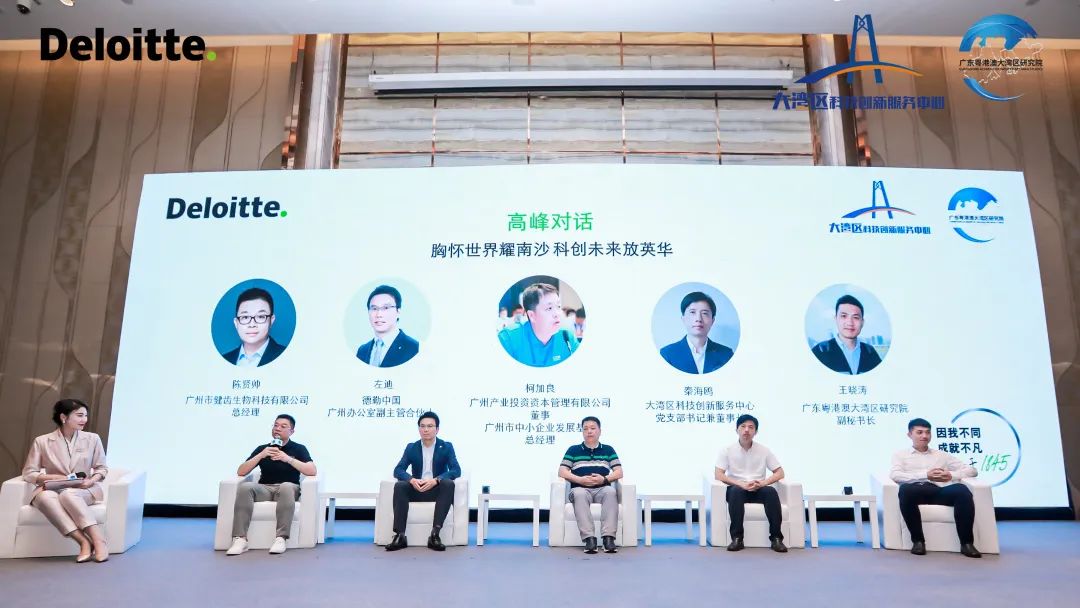 健齿生物总经理陈贤帅、中小企业发展基金有限公司总经理柯加良、德勤中国广州办公室副主管合伙人左迪、大湾区科创中心党支部书记董事长秦海鸥、广东粤港澳大湾区研究院副秘书长王晓涛参与高峰对话。对话嘉宾围绕“筑基”“求本”和“科创未来”三大方面展开,对于大湾区内科创企业需要以研发为本、聚焦基础研究,通过创新驱动未来可持续发展。
