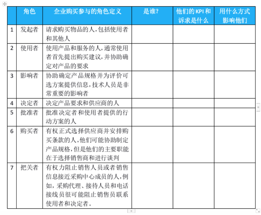 第一维度:角色:发起者、使用者、影响者、决策者、批准者、采购者、把关者。