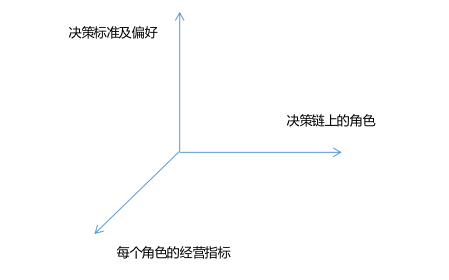 之前我写过的一篇文章《这一张表让你的B2B营销段位更上一层楼》总结了决策链上的角色,并制作了一张表格,研究不同角色的KPI是什么,今天我的分析模型里要将决策链角色及影响因素1.0版里的“KPI”升级为“经营指标”,并且增加第三维度——“决策标准及偏好”,图表升级为决策链角色及影响因素2.0版《三维决策分析》。