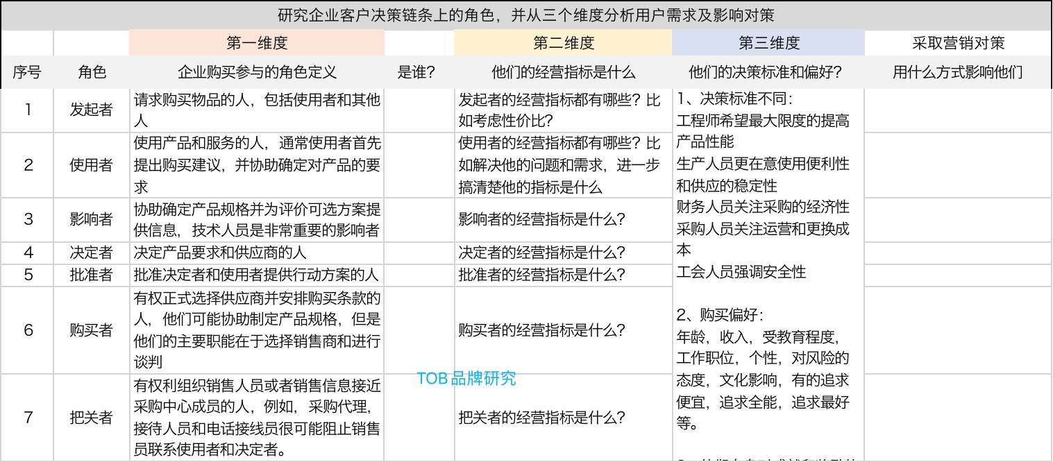 三个维度组成了企业客户的三维决策模型,>我们只需要对着这张表格,一条一条地分析你将要影响的客户决策链上的每一个角色的经营指标,决策偏好,岗位考量等因素,有的放矢制定相应的营销策略及品牌策略。