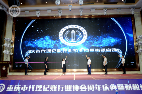 上午11时,《重庆市代理记账行业执业质量指引》隆重发布,重庆市财政局会计处处长朱晓东、重庆市民政局社会组织综合党委专职副书记何悦、重庆市税务局纳税服务处巡视员耿勇、重庆市市场监督管理局企业监督处副处长王忠民、重庆市经信委民营经济发展服务处谭毅科长、重庆市代理记账行业协会会长冯璞共同进行《执业质量指引》发布启动仪式。