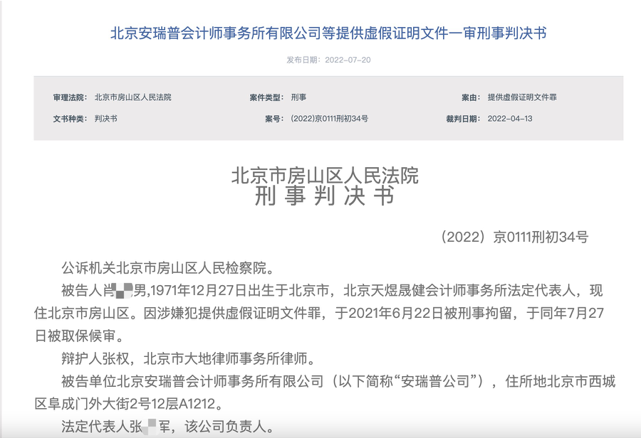 7月20日,北京法院审判信息网披露了一份一审刑事判决文书,揭露了注册会计师编造虚假审计报告底稿,并通过长期合作的会计师事务所出具正式审计报告,用于相关企业向银行套取贷款的过程。