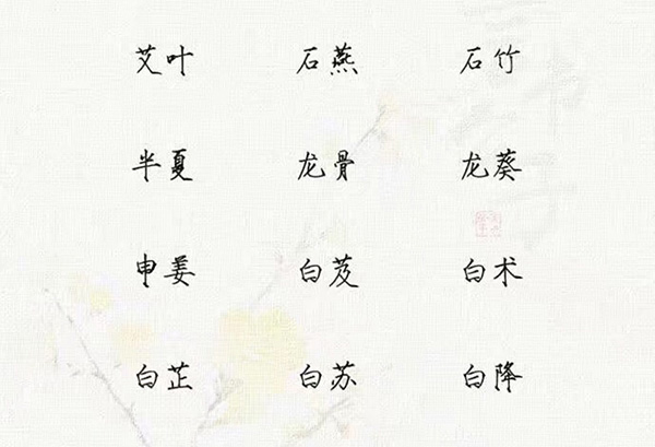8. 艾叶 石燕 石竹 半夏 龙骨 龙葵 申姜 白芨 白术 白芷 白苏 白降
