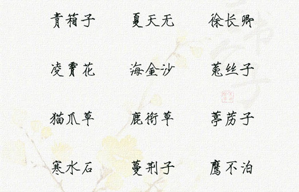 5. 青葙子 夏天无 徐长卿 凌霄花 海金沙 菟丝子 猫爪草 鹿衔草 葶苈子 寒水石 蔓荆子 鹰不泊