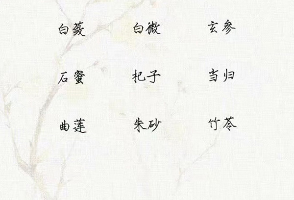 4. 白蔹 白微 玄参 石蜜 杞子 当归 曲莲 朱砂 竹苓