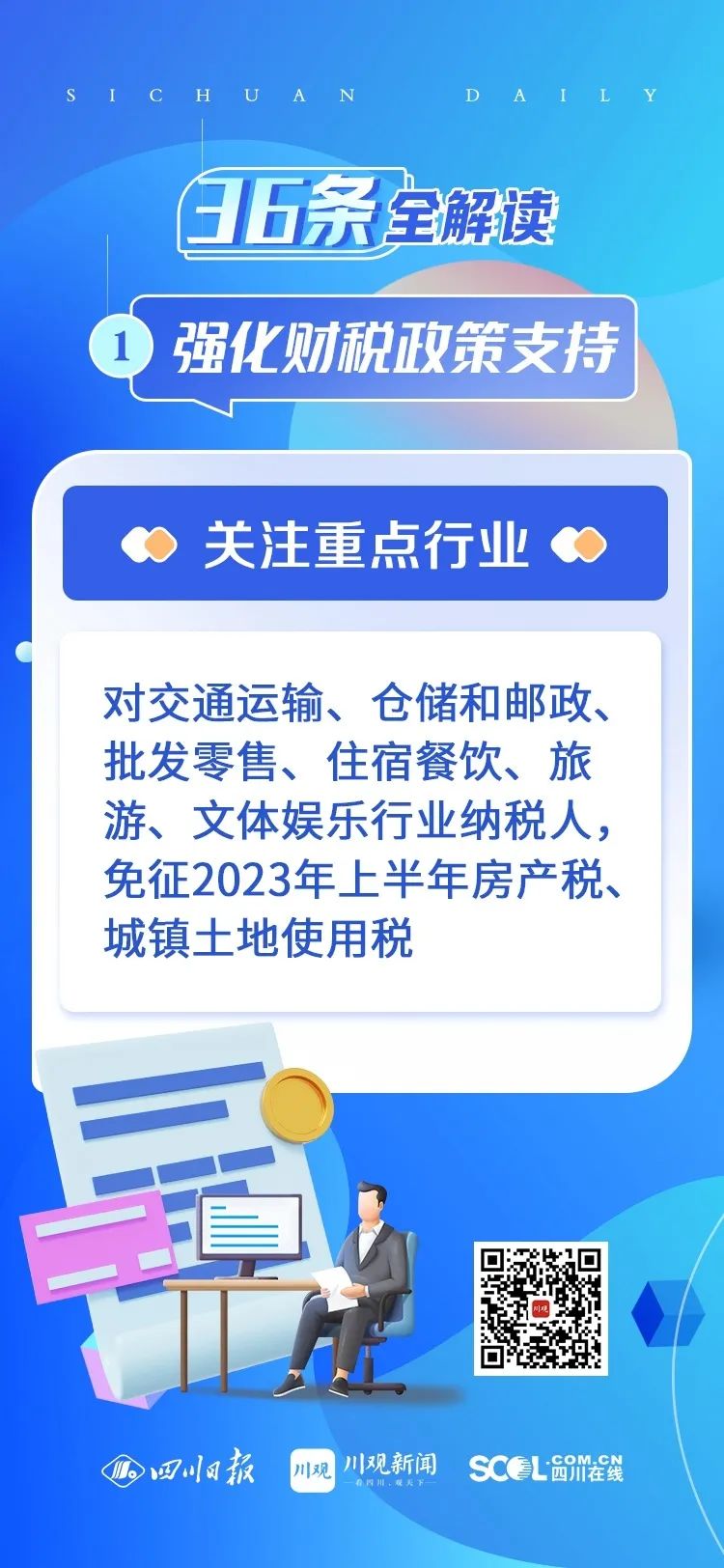 除了上述的延续性政策,今年还有不少新政策,部分行业阶段性免征房产税、城镇土地使用税是其中的一项。“36条”明确,对交通运输、仓储和邮政、批发零售、住宿餐饮、旅游、文体娱乐行业纳税人,免征2023年上半年房产税、城镇土地使用税。