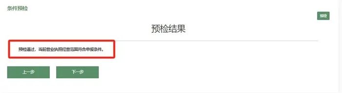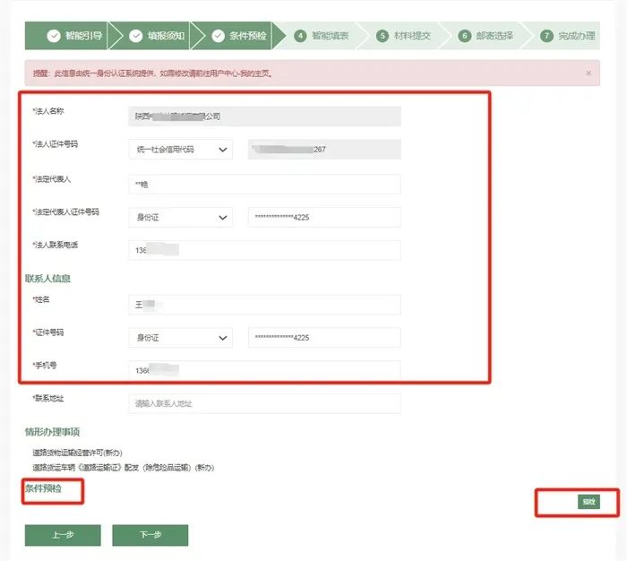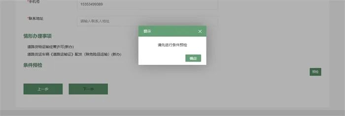 06.“条件预检”阶段,除“联系地址”外均为系统自动带出,不需要手动填写,如未带出,请不要操作并稍等片刻,待系统加载完成后再点击下一步。系统接入了全省营业执照数据,系统会根据自己经营范围进行预检,如果经营范围包含“普通货运、专用运输(集装箱、冷藏保鲜设备、罐式容器)、大型物件运输”之一时,则预检通过,可继续办理。如果预检不通过,则无法继续办理。