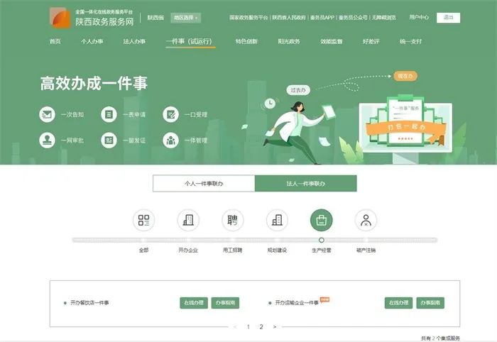 02.申请人选择“一件事(试运行)”、“法人一件事联办”、“生产经营”,进入“陕西省开办运输企业一件事”,查看“办事指南”或选择“在线办理”。