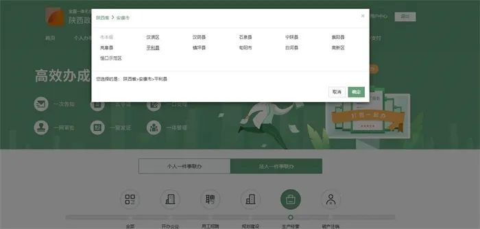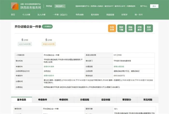 在陕西省政务服务网首页选择“一件事(试运行)”,选择“法人一件事联办”“开办运输企业一件事”,点击对应的“办事指南”,选择就近办理的区域,即可查看对应地区的牵头部门、办理时间、办理地点、咨询电话及监督投诉方式等内容。