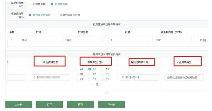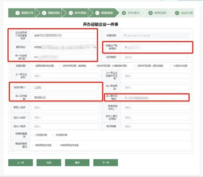07.“智能填表”阶段,系统接入了全省市场主体、道路运输行业从业资格、综合检验检测等数据,会自动免填写一些字段,申请人可不需要手动填写,如未带出,请不要操作并稍等片刻。按照系统要求,进行信息的补全,方可再点击下一步。