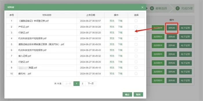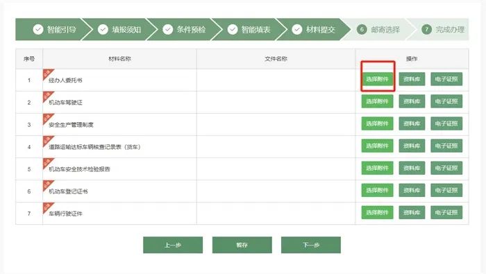 08.在“材料上传”步骤,用户需要提交8个相关材料,具体为经办人委托书、机动车登记证书、道路运输达标车辆核查记录表(货车)、车辆行驶证件、机动车安全技术检验报告、运输车辆照片、机动车驾驶证、安全生产管理制度(个体户提供安全运营承诺书),材料必须为原件彩色扫描件,具体样本或样表从办事指南页面可下载。系统提供了多种文件上传途径。如本地上传、资料库、电子证照。
