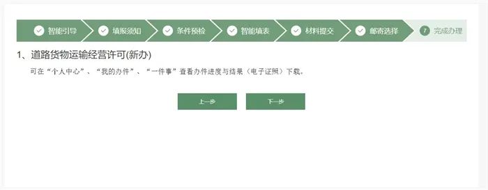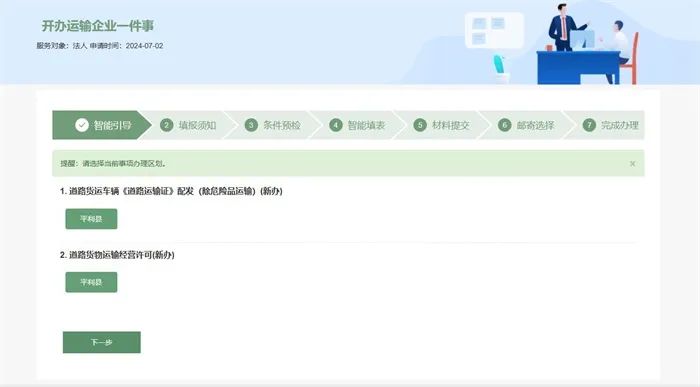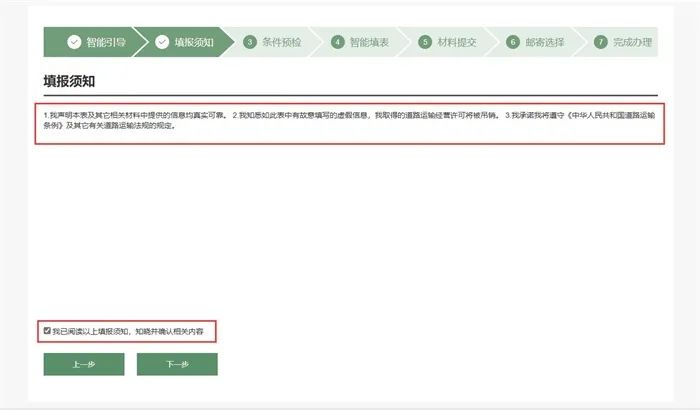 05.申请人在申报开办运输企业一件事时,需要对填报内容进行承诺,保障材料的真实性,否则已取得的对应证件将被自动吊销,并不允许再次通过网上进行申报。确定后,选择下一步即可。