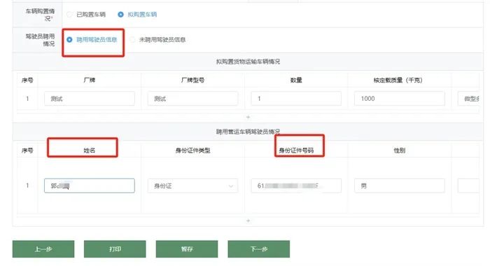在拟聘用驾驶员页面,申请人需要填写符合要求的驾驶员信息。输入“姓名”、“身份证号”点击任意空白处,可带出“身份证类型”、“性别”、“从业资格证号”、“准驾车型代码”、“驾驶证处领日期”5个免填写字段。