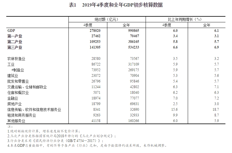 2019年四季度和全年国内生产总值(GDP)初步核算结果