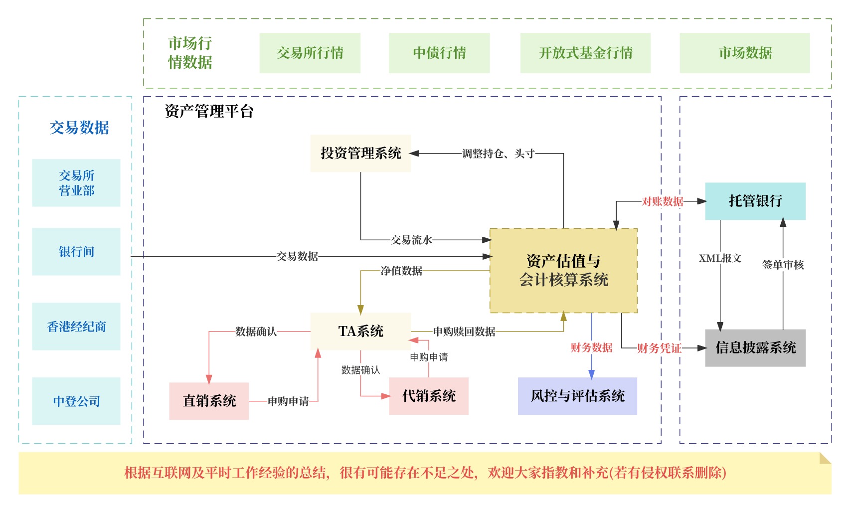 在开篇之前,让我们一起看下基金公司系统架结构图,方便大家从宏观入手知其全貌,财务在整个系统中位置、应用、上下游关系、有什么参与者、数据传输、数据结构、信息如何流转等关系;然后再去深究每个环节的微观细节,如此我们才能真正的完整的系统把握好。