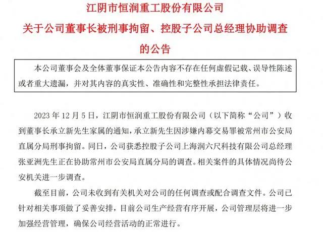 12月5日晚间,恒润股份董事长因涉嫌内幕交易罪被刑事拘留,控股子公司总经理也正在协助调查。