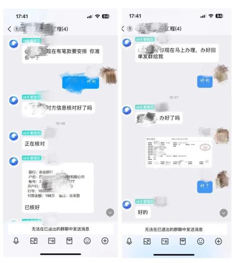 之后,“老板”询问公司账面可用资金时,小张便把公司账户余额发在了群里。接着,“老板”发来一张银行转账信息,谎称有一笔往来款需要安排。
