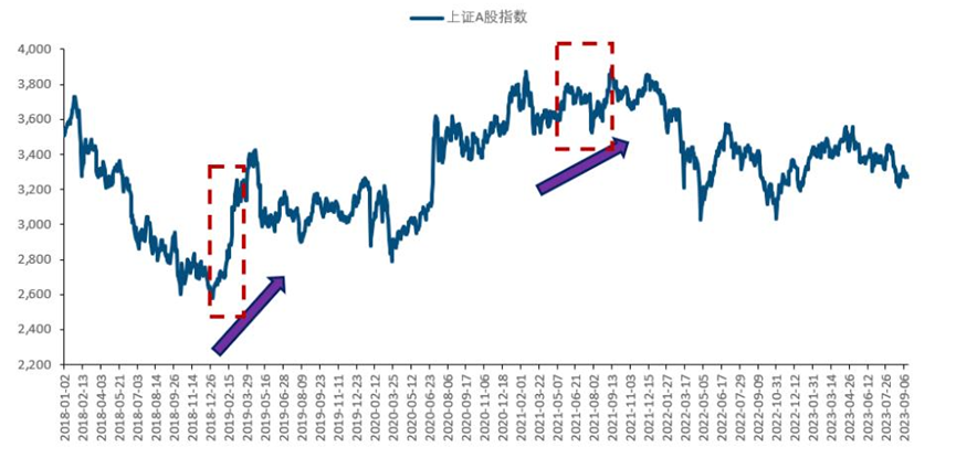 例如2018年10月至2019年9月的“回购潮”,此前万得全A于2018年1月来到4757的阶段性高位,随后在国内外多种因素影响下一路下行,2018年10月来到3180点,在2019年初降准等政策利好下,逐步上行。
