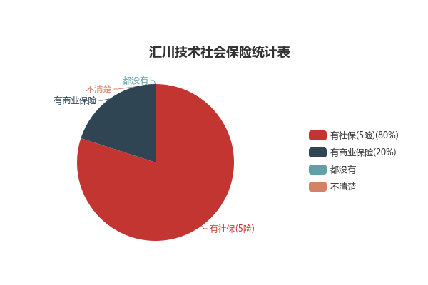 在汇川技术工作的人80%的反馈有社保(5险),20%的反馈有商业保险,具体见以下统计图。