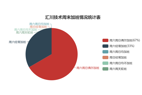 在汇川技术工作的人33%的反馈周六经常加班,66%的反馈周六周日偶尔加班,具体见以下统计图。