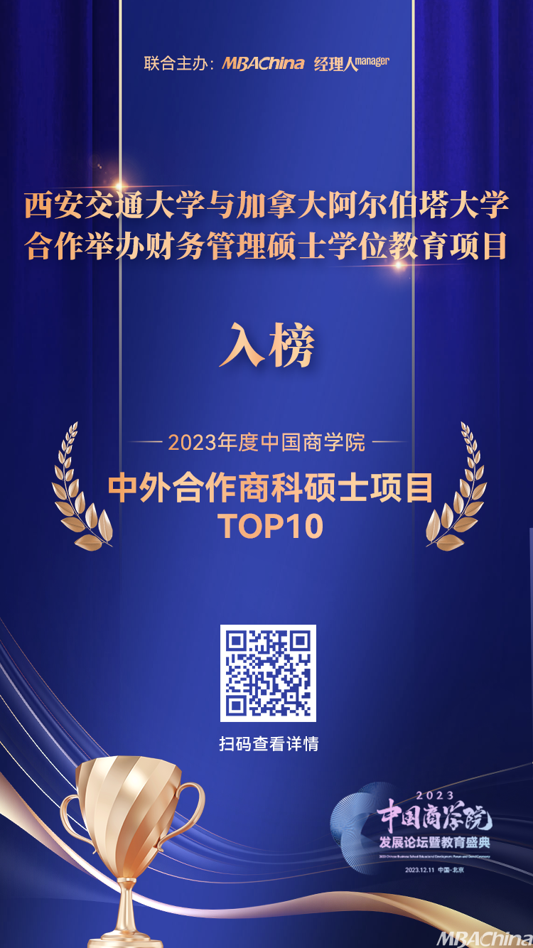 祝贺西安交通大学与加拿大阿尔伯塔大学合作举办财务管理硕士学位教育项目荣获“2023年度中国商学院中外合作商科硕士项目TOP10”第八名!