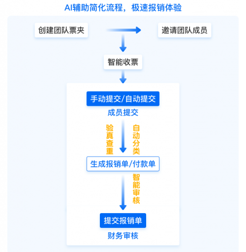 企业票夹面向小微企业或项目团队,在智能发票管理的基础上,实现多人协同管票,票夹成员自动提交发票,AI完成验真查重等智能审核,生成报销单或付款单,最后由财务进行审核,极大提升了报销效率与准确度,既满足了小微企业智能报销的需求,又没有传统费控系统的高投入、高门槛。