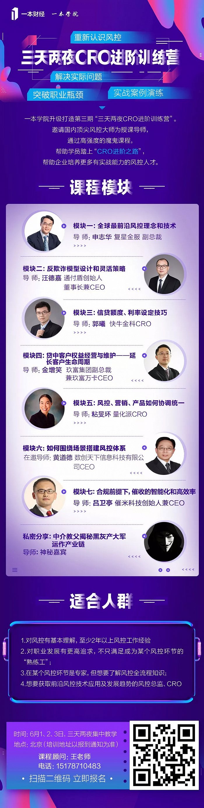 第三期“三天两夜CRO进阶训练营”,邀请国内顶尖风控大师为授课导师,通过高强度的魔鬼课程,帮助学员踏上“CRO进阶之路”。