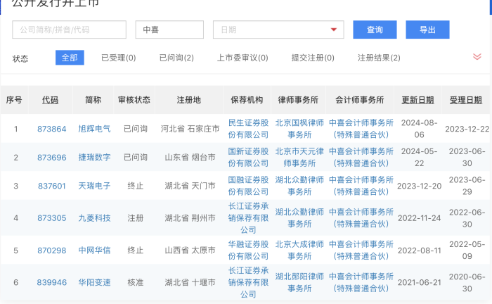 北交所方面历史记录显示,中喜所也涉及6个项目,同样相关签字注册会计师同样不涉及朱耀军、刘文军二人。